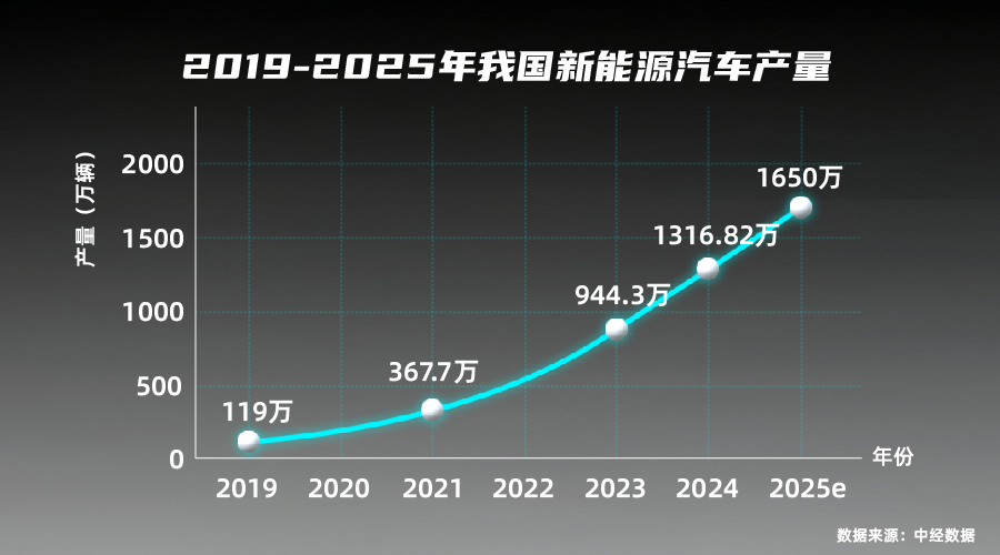 在政策与市场的双轮驱动下,中国新能源汽车市场实现蓬勃发展与技术飞跃,市场规模持续扩张,预估2025年新能源汽车产量将达到1650万辆。