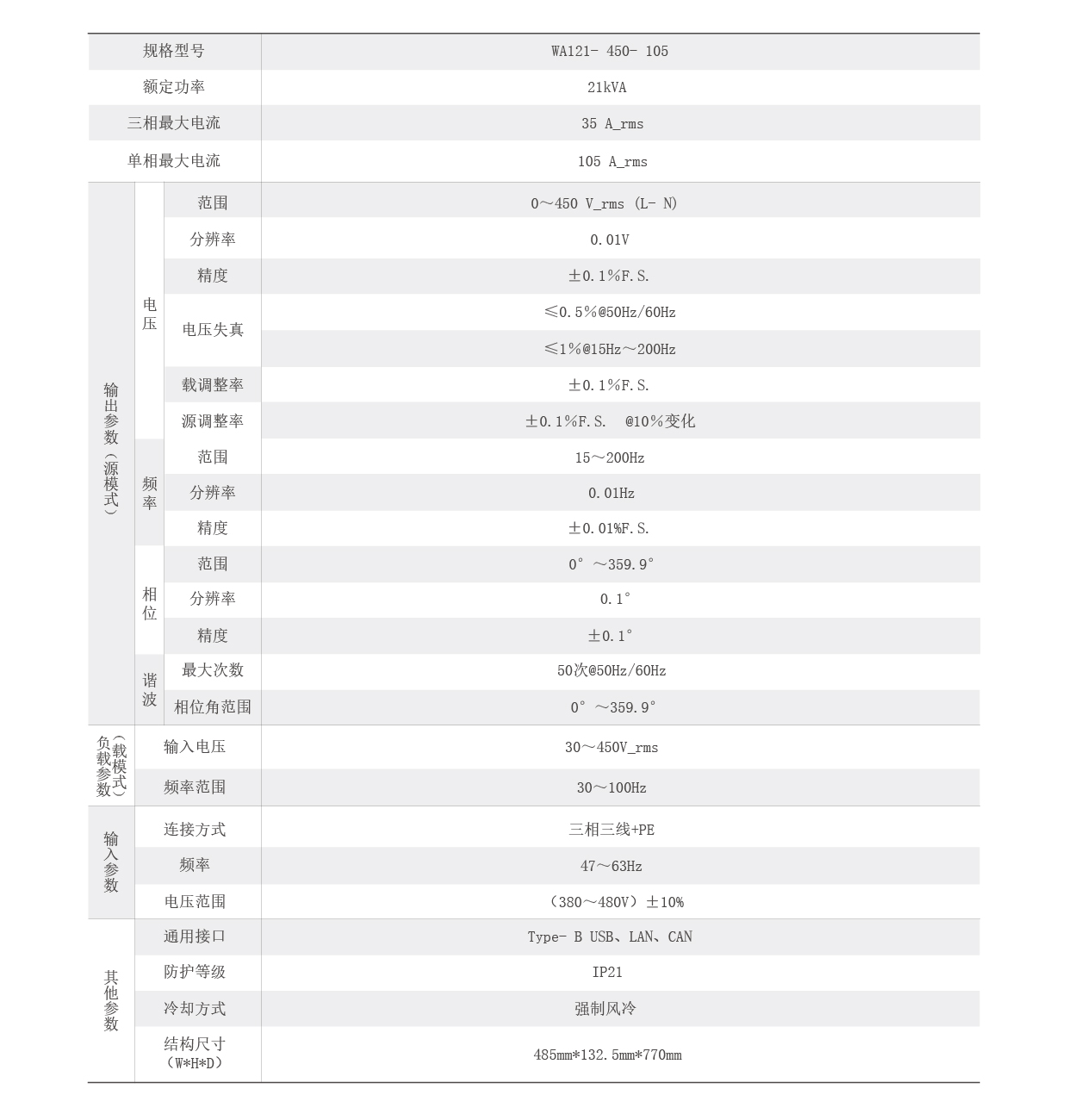 回馈式电网模拟器WA系列是一款基于第三代SIC技术研发的可编程回馈式交流源,具备交直流四象限的工作能力。既可作为交流电源,满足一般电网适应性法规测试需求,输出平稳的电压和频率,提供电压变化、频率变化、相位变化,满足谐波、三相不平衡、电压智降、闪变等多种电能质量相关特性的供电环境。也可以接收负载返回的能量,并回馈到电网,具有高达91%的回馈效率。回馈式电网模拟器WA系列是一款高精度、高动态、高标准、具备全面电网特性模拟的双向电源。